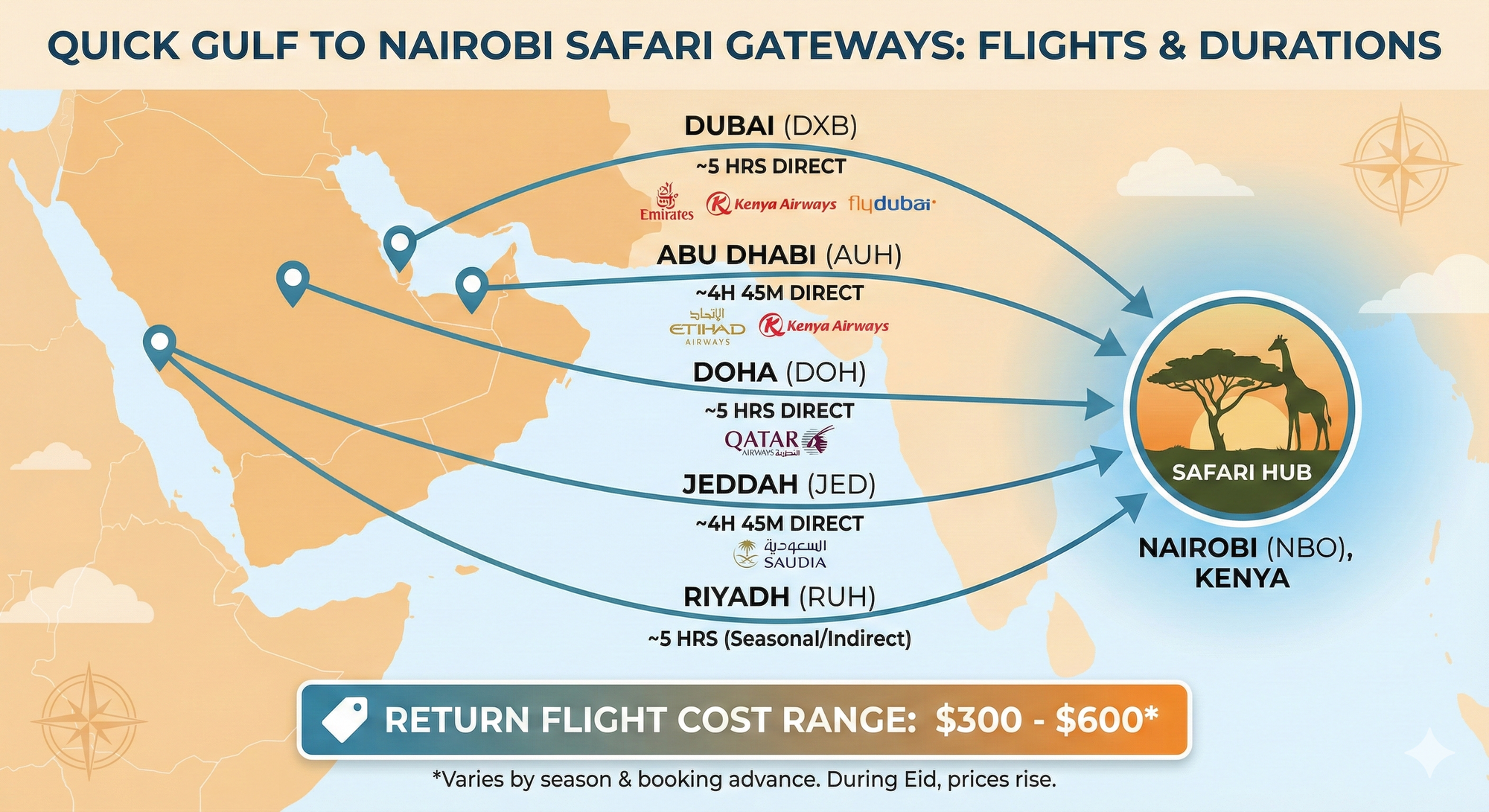| Retourvlucht (Golf – Nairobi) | $300–$600 |